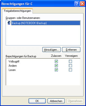 Als Freigabename wurde 'C' gewählt und hierfür eine Freigabeberechtigung für den Lokalen-Benutzer 'NOTEBOOK\Backup' erstellt, welcher einen Vollzugriff für die Freigabe besitzt, sodass auch ein Sichern und Widerherstellen möglich ist. Zuvor wurde der Lokale Benutzer 'Backup' dem System hinzugeführt und mit Administrationsrechten und einen Passwort versehen. Wie auch schon beim vorherigen Linux-Client ist auch für den Windows-Client eine individuelle '<CLIENT>.pl' zu erstellen., hier in diesem Beispiel mit den Namen 'notebook.pl':