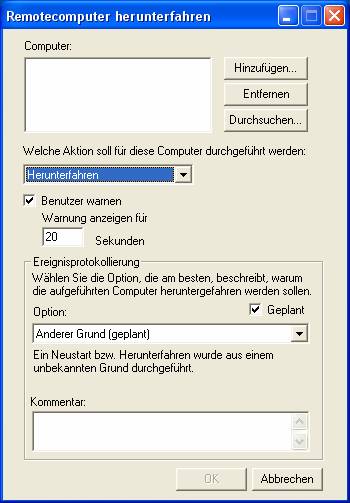 Auch kann Das Microsoft-Programm: 'shutdown.exe' als GUI-Tool aufgerufen werden, der Aufruf muss dann mit der Option: '-i' erfolgen.