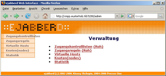 Bevor mit dem Web-Interface gearbeitet werden kann, ist zuvor eine Authentifizierung notwendig. Bezogen auf die oben gemachten Eingaben, sollte der Zugang als Benutzer: 'admin@xmpp.eusterholz.tld' mit dem Passwort 'secret' gelingen. Mittels der Web-Oberfläche kann nun der Server mainteniert werden, auch können Informationen wie z.B. Statistiken abgerufen werden.