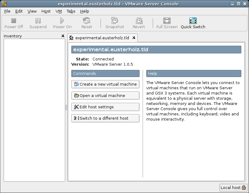 Mit dem Button: 'Create a new virtual machine' können nun eigene 'VMware'-Images erstellt werden und mit dem Butten: 'Open a virtual machine' kann ein bestehendes gestartet werden. Weitere Bedienungen können in der Dokumentation zum 'VMware Server' nachgelesen werden. AnmerkungenDas genaue Protokoll für die Installation von 'VMware Player' und 'VMware Server' kann als Textdatei, siehe Link unten, eingesehen werden. Die Deinstallation von 'VMware Player' bzw. 'VMware Server' kann durch Ausführung des folgenden Kommandos geschehen: